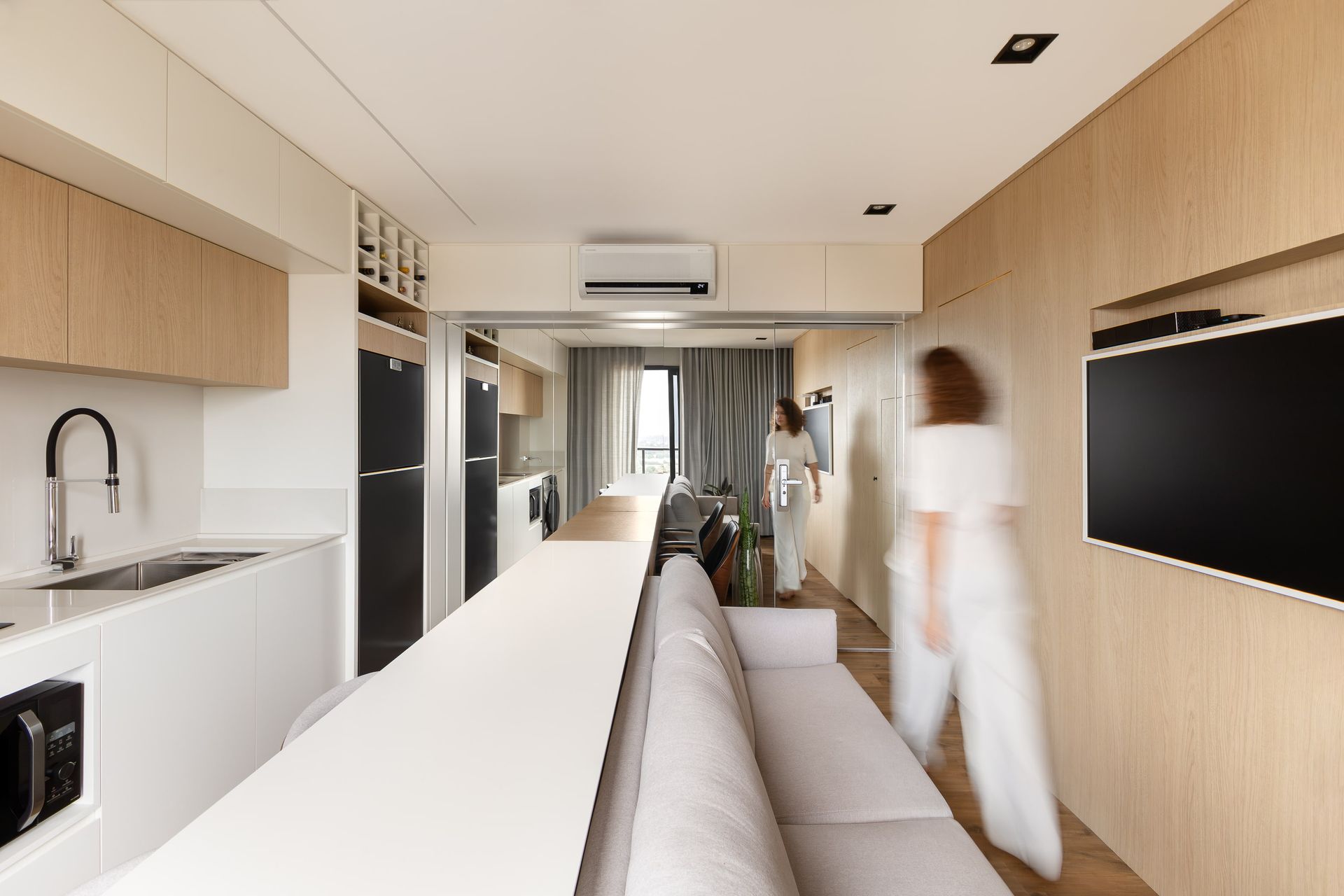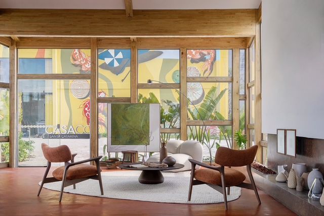 Sustentabilidade também se faz presente em cada escolha: da madeira de reflorestamento ao reaproveitamento da antiga estrutura, o projeto é, por si só, um exercício da consciência de que nada se perde, mas pode ser ressignificado. A curadoria de mobiliário e arte feita pelo escritório também confluem para esta narrativa: a Poltrona Fita de Guilherme Wentz, a mesa de centro Maha de Luan del Savio, a mesa lateral Porú de Lucas Takaoka e as obras exclusivas do artista Eliézer Branco se fundem ao espaço, vigorando em camadas de design e identidade.