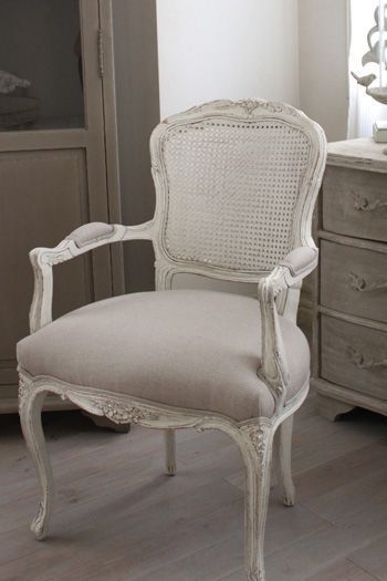 Aparadores e cômodas com curvas suaves e pintura esbranquiçada.